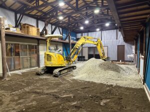 超おしゃれでかっこいい土間工事をさせて頂きました✨今日はまず…砕石敷きの様子です♪もうすでに周りがカッコ良すぎる♡♡この周りのかっこよさに負けない超おしゃれな土間工事するぞ!と意気込みま