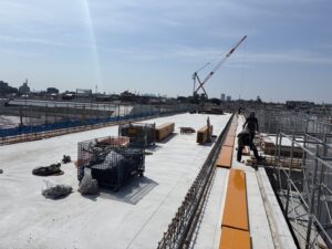 本日はR階でのパラペット建込み作業です📣広い屋上に資材を並べ、チームで声を掛け合いながら丁寧に組み上げていきます✨安全帯をしっかり着用し、狭い足場でも集中を切らさず作業を