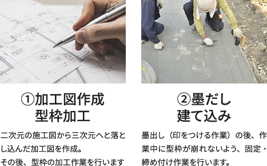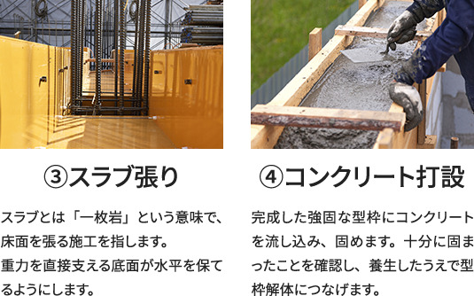 ベニヤ板の型枠に鉄骨・鉄筋を組み、コンクリートを流し込み固めます。コンクリートはやり直しが利かないため、迅速に・正確に進行します。
