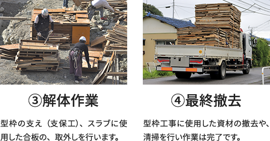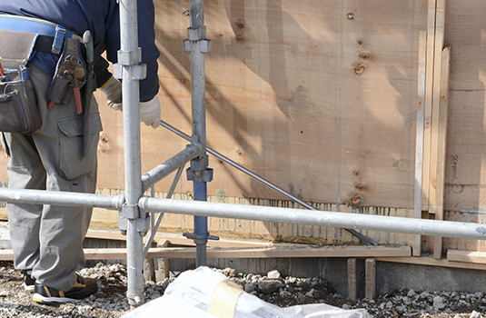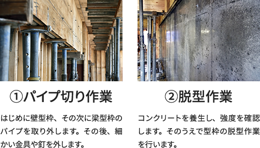 頑丈に組立てた型枠は、解体の際にも入念に配慮する必要があります。完成した型枠の破損や現場での事故が起こらぬよう、慎重に行います。